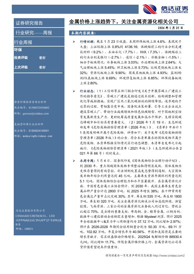 信达证券:环保行业周报:金属价格上涨趋势下,关注金属资源化相关公司.pdf