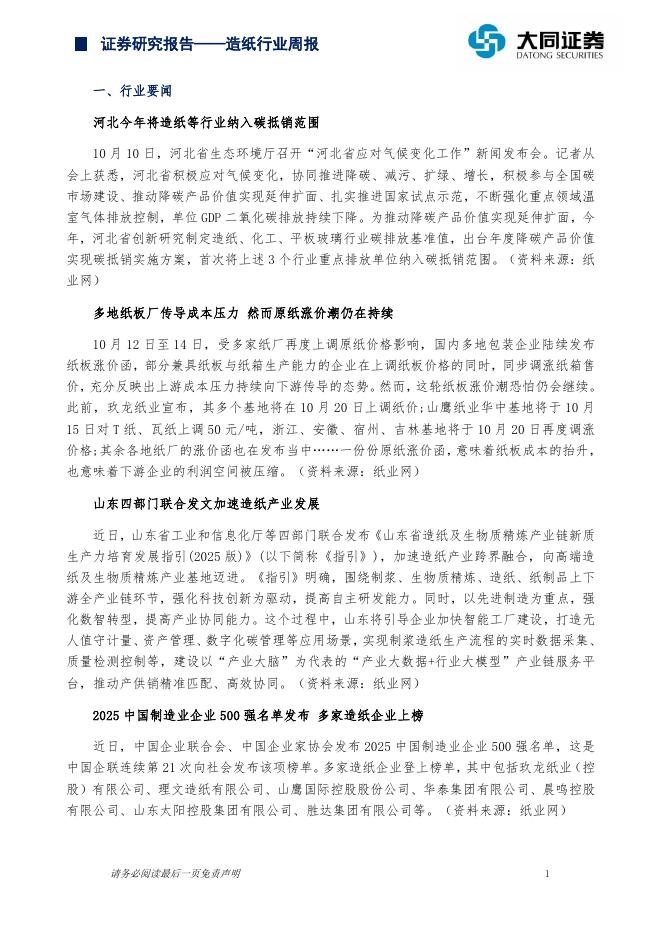 大同证券:造纸行业周报:包装纸提价潮延续,造纸板块盈利修复可期.pdf