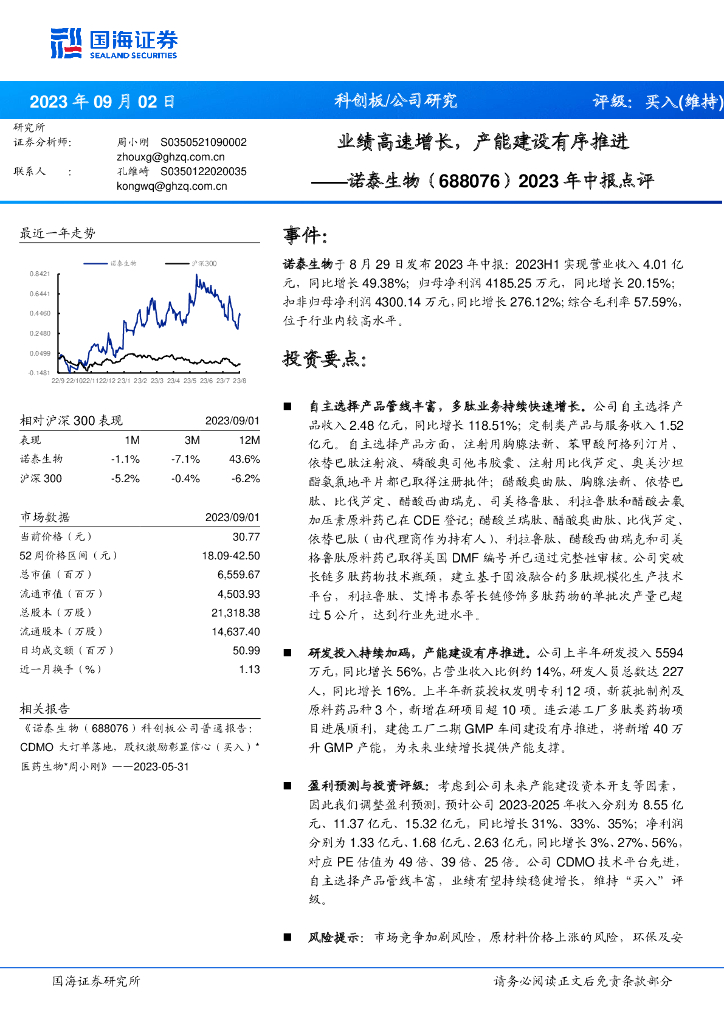国海证券:诺泰生物(688076)-2023年中报点评:业绩高速增长,产能建设有序推进.pdf