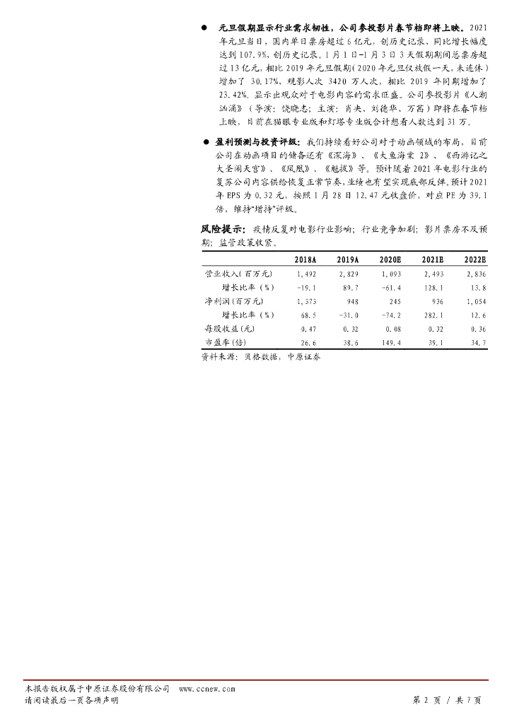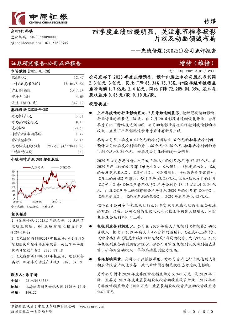 中原证券:光线传媒(300251)-公司点评报告:四季度业绩回暖明显,关注春节档参投影片以及动画领域布局.pdf