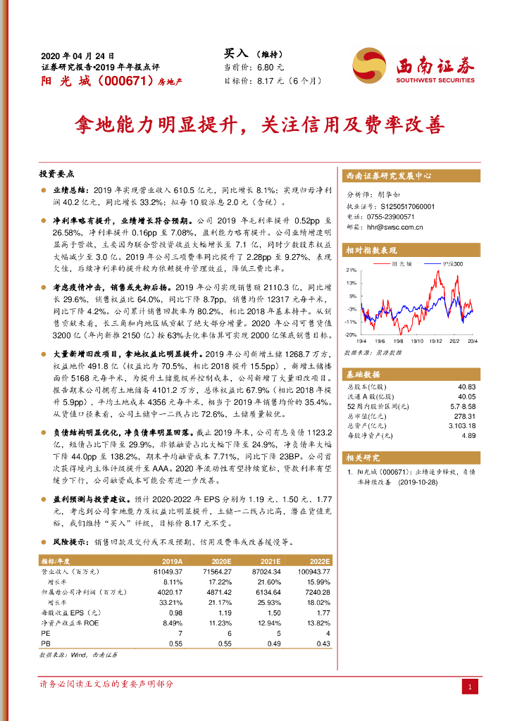 西南证券:阳光城(000671)-拿地能力明显提升,关注信用及费率改善.pdf