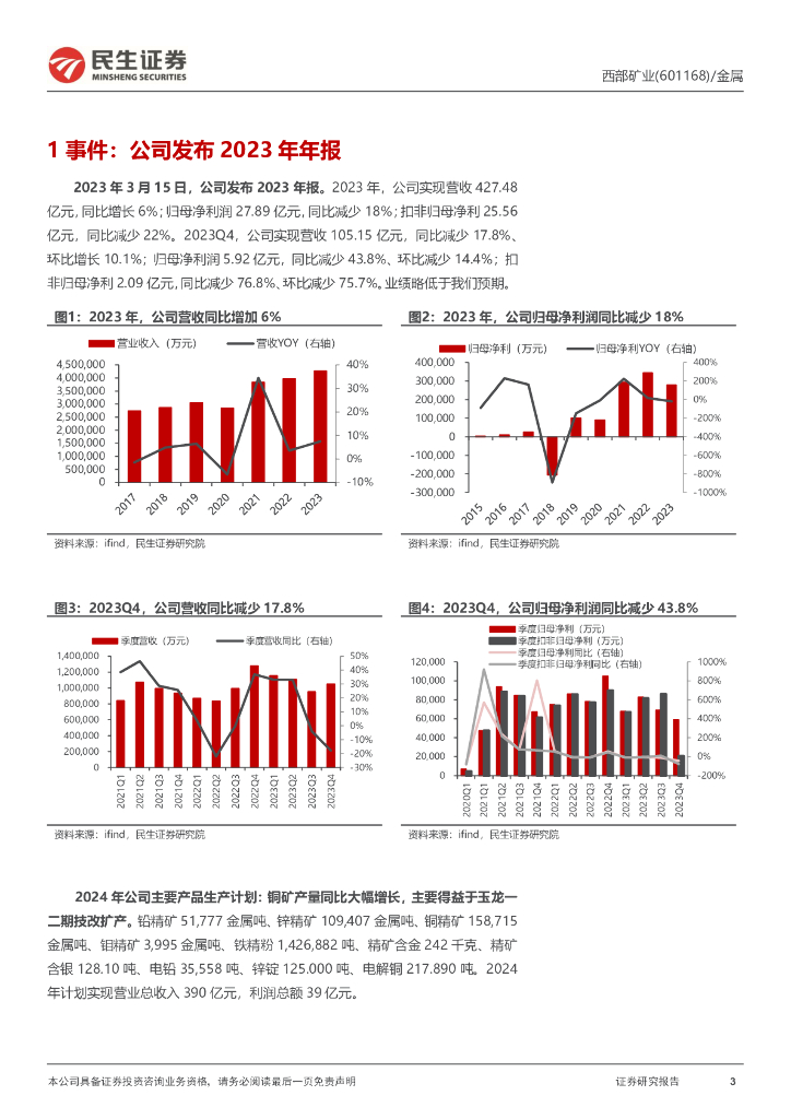 民生证券:西部矿业(601168)-2023年年报点评:Q4业绩略低于预期,期待玉龙扩建放量.pdf
