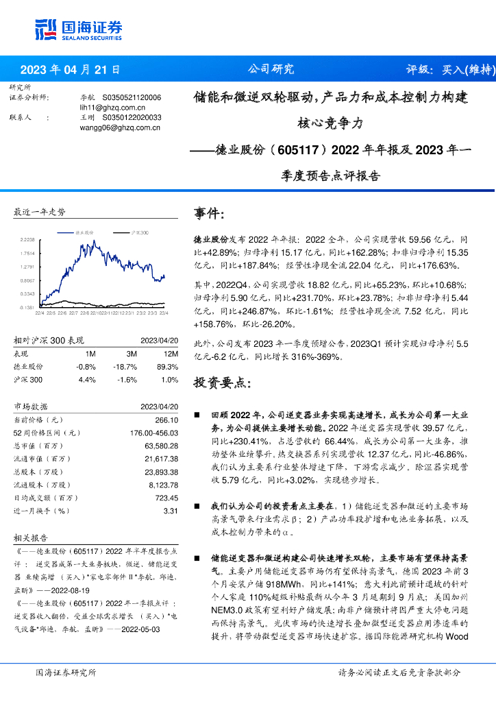 国海证券:德业股份(605117)-2022年年报及2023年一季度预告点评报告:储能和微逆双轮驱动,产品力和成本控制力构建核心竞争力.pdf