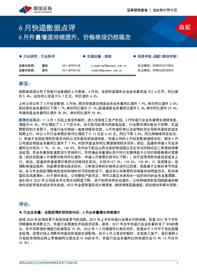 国信证券:6月快递数据点评:6月件量增速持续提升,价格表现仍然稳定.pdf