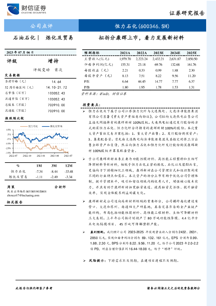 财信证券:恒力石化(600346)-拟拆分康辉上市,着力发展新材料.pdf