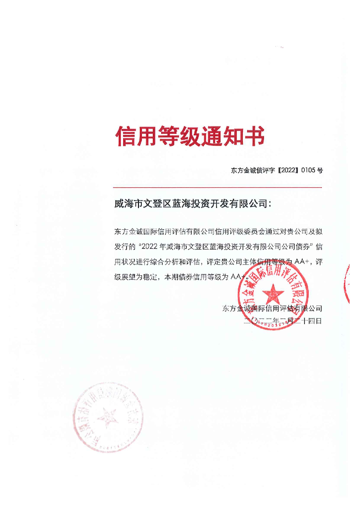东方金诚:2022年威海市文登区蓝海投资开发有限公司公司债券评级报告.pdf