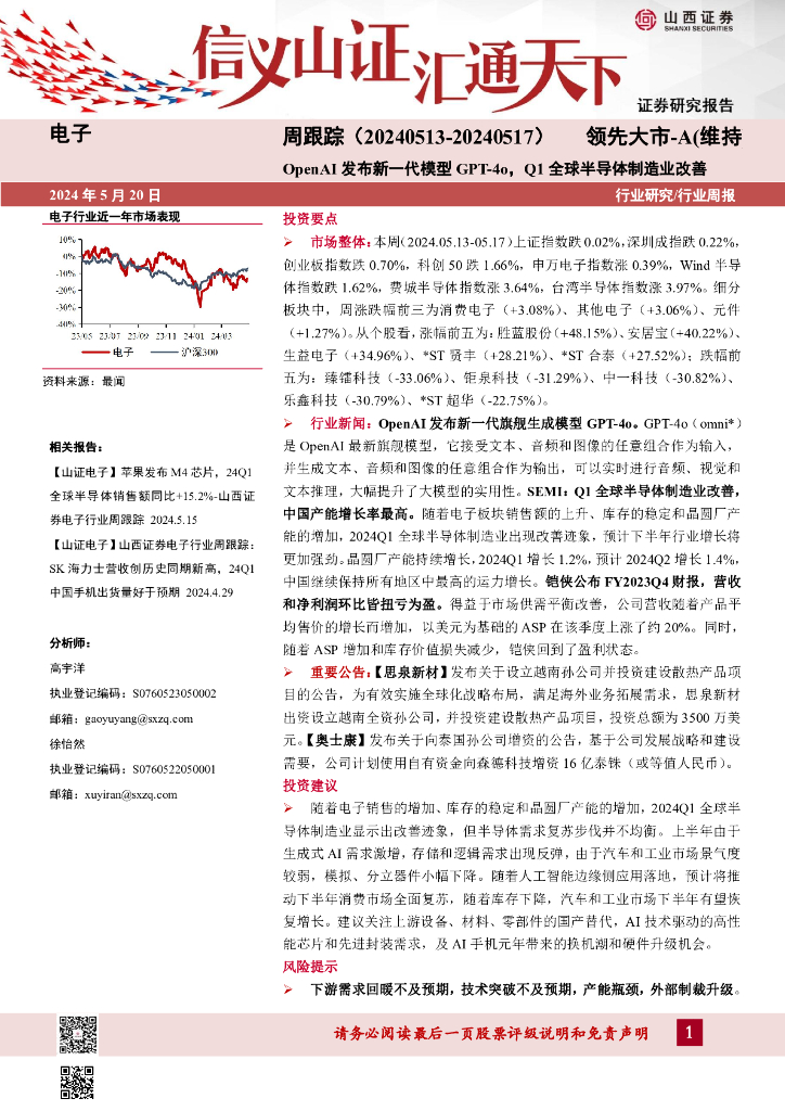 山西证券:电子周跟踪:OpenAI发布新一代模型GPT-4o,Q1全球半导体制造业改善.pdf