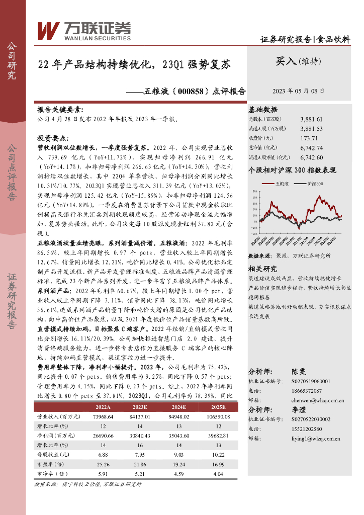 万联证券:五粮液(000858)-点评报告:22年产品结构持续优化,23Q1强势复苏.pdf