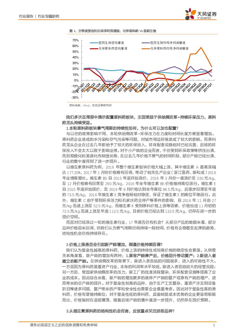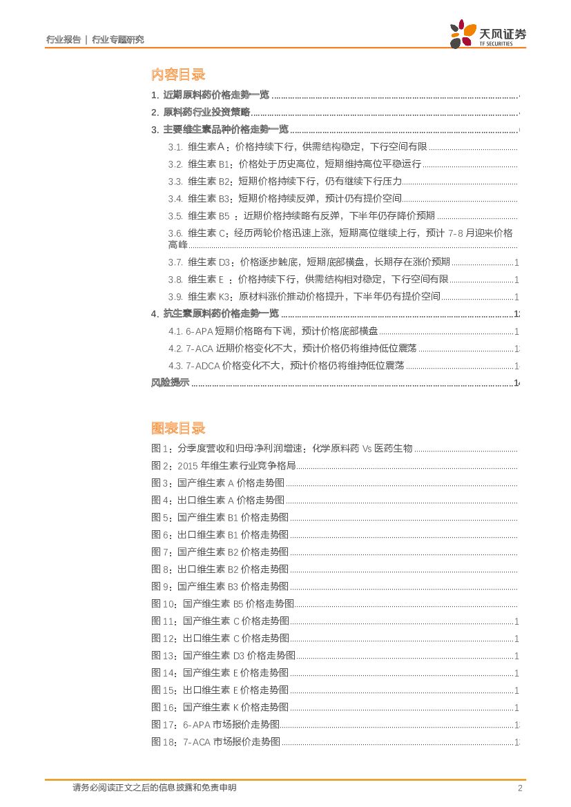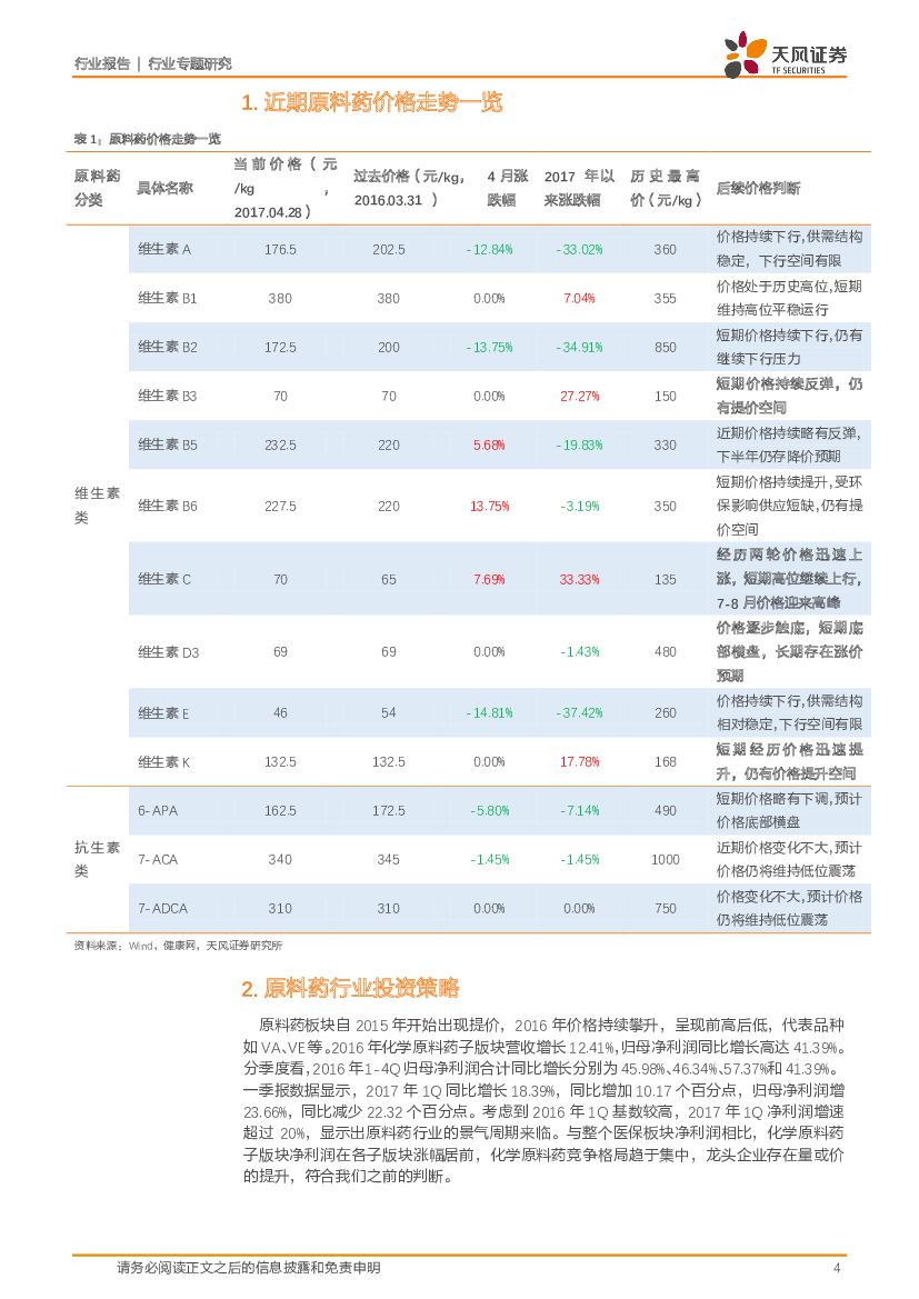 天风证券:医药生物行业专题研究:原料药行业4月月报-VA、VE价格持续下行,VD3存在提价预期,关注细分领域龙头个股.pdf
