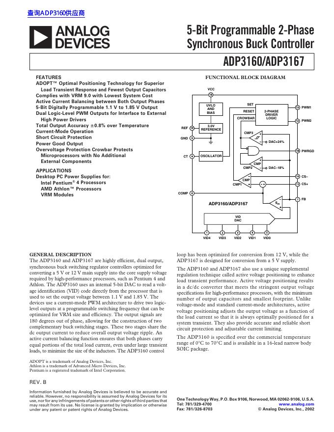 ANALOG DEVICESADP3160/ADP3167 5-Bit Programmable 2-Phase Synchronous Buck Controller 数据手册.pdf