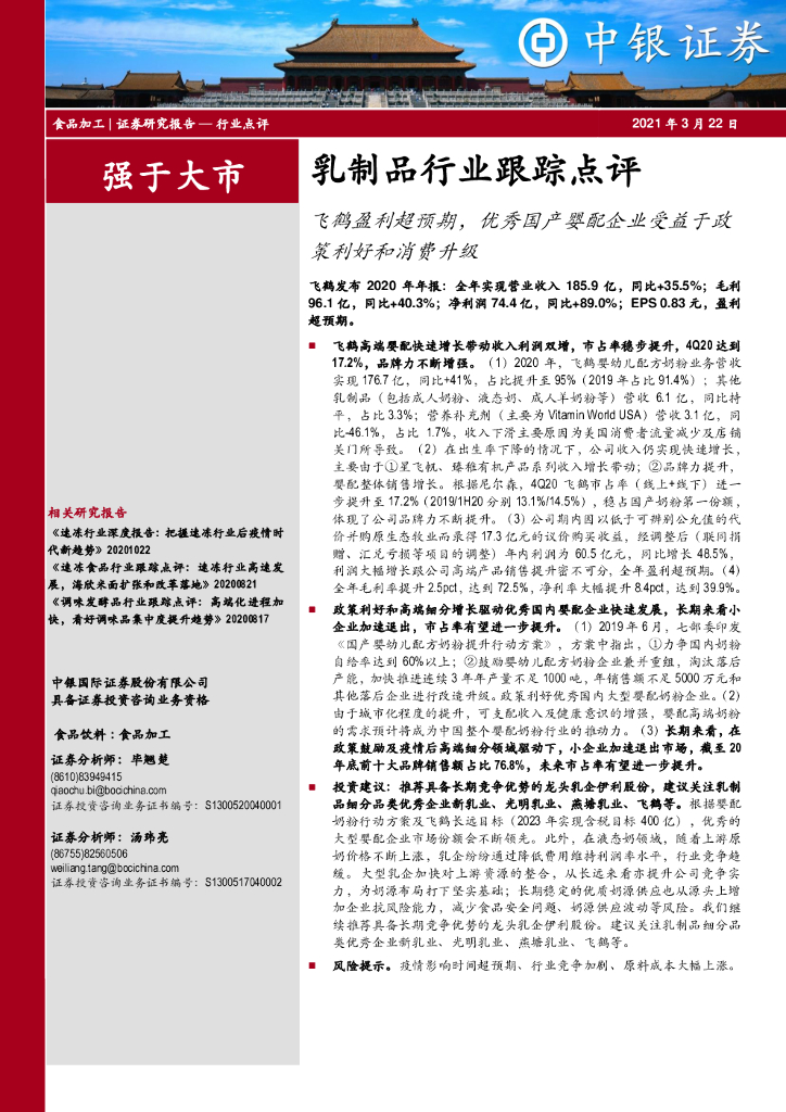 中银证券:乳制品行业跟踪点评:飞鹤盈利超预期,优秀国产婴配企业受益于政策利好和消费升级.pdf