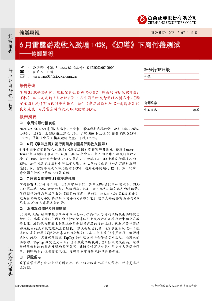 浙商证券:传媒周报:6月雷霆游戏收入激增143%,《幻塔》下周付费测试.pdf