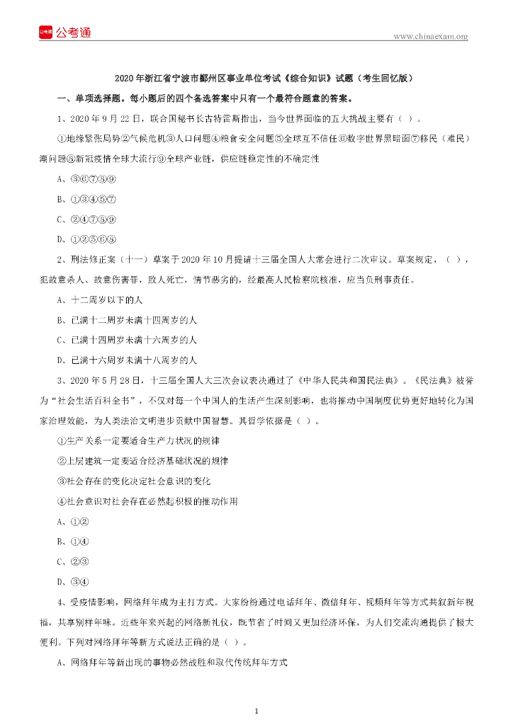 2020年浙江省宁波市鄞州区事业单位考试《综合知识》试题.pdf