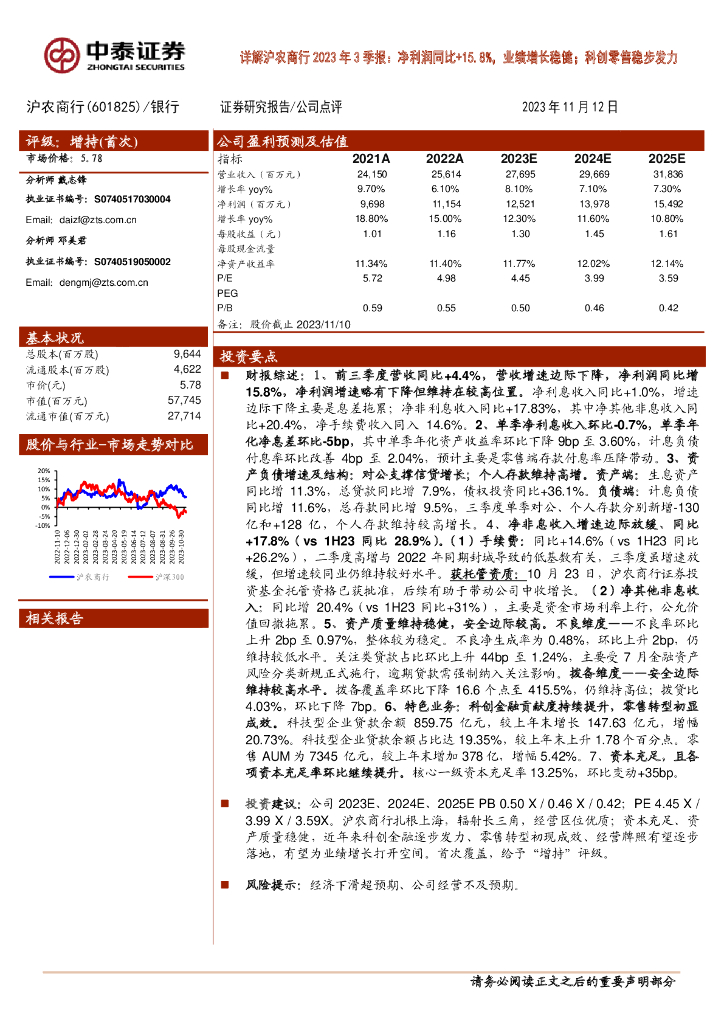 中泰证券:沪农商行(601825)-2023年3季报:净利润同比+15.8%,业绩增长稳健;科创零售稳步发力.pdf