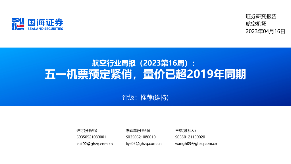 国海证券:航空行业周报(2023第16周):五一机票预定紧俏,量价已超2019年同期.pdf