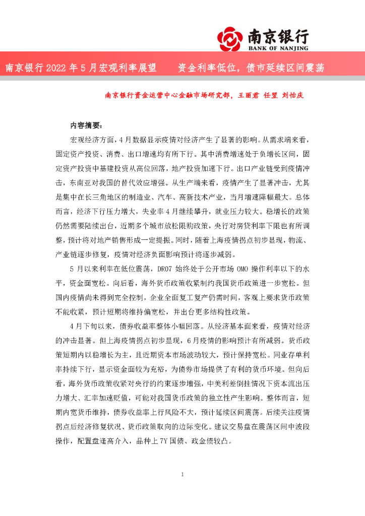 南京银行:2022年5月宏观利率展望:资金利率低位,债市延续区间震荡.pdf