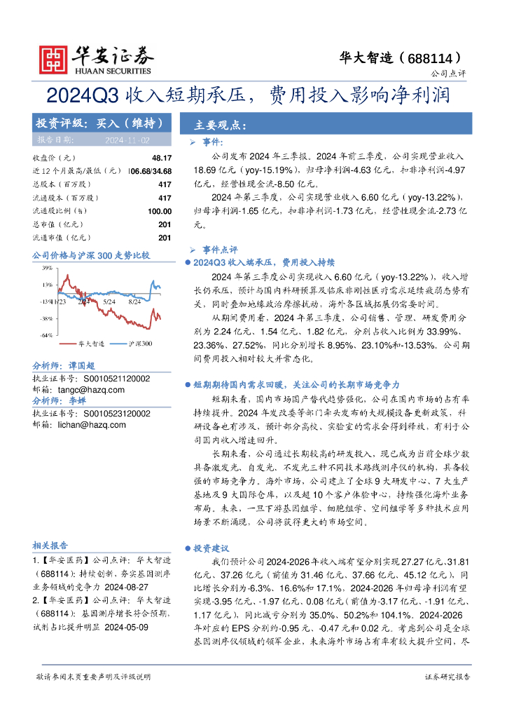 华安证券:华大智造(688114)-2024Q3收入短期承压,费用投入影响净利润.pdf