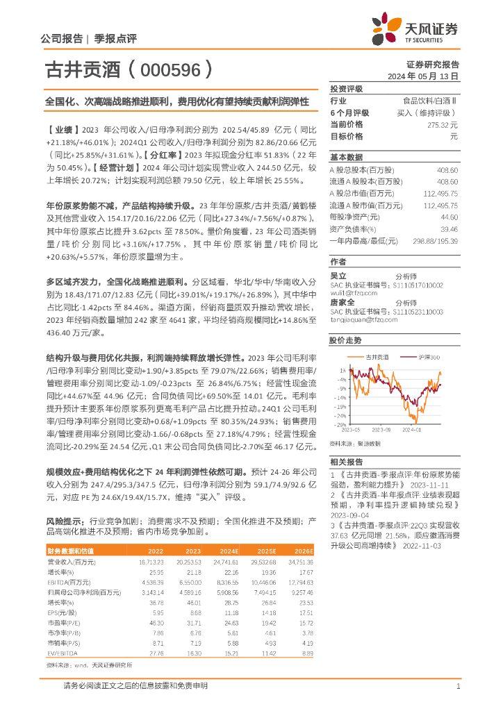天风证券:古井贡酒(000596)-季报点评:全国化、次高端战略推进顺利,费用优化有望持续贡献利润弹性.pdf