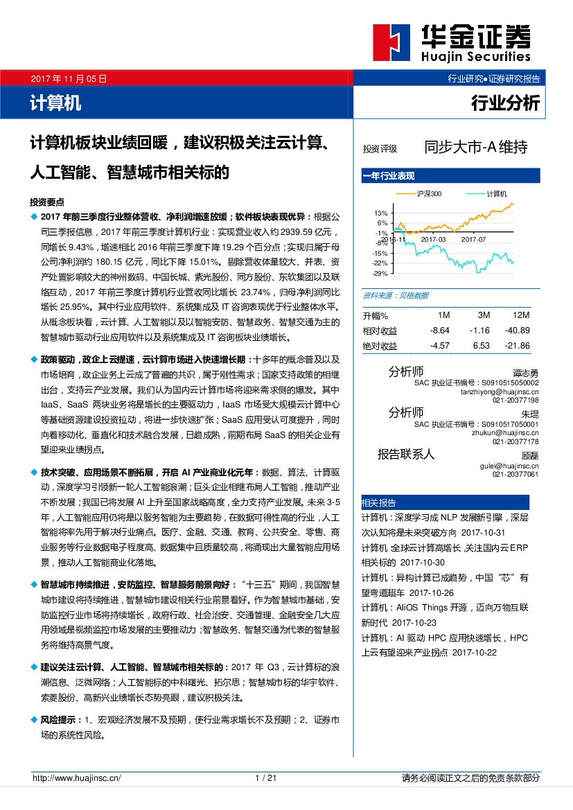 华金证券:计算机行业分析:计算机板块业绩回暖,建议积极关注云计算、人工智能、智慧城市相关标的.pdf