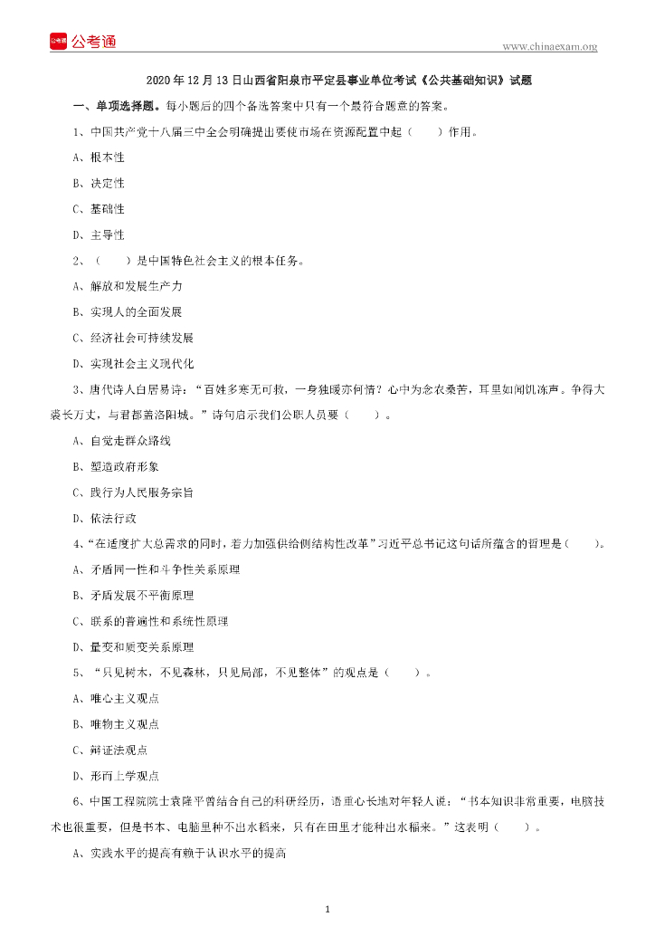 2020年12月13日山西省阳泉市平定县事业单位考试《公共基础知识》试题.pdf
