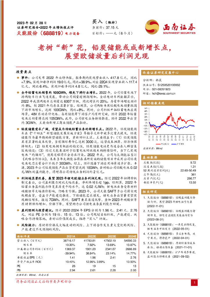 西南证券:天能股份(688819)-老树“新”花,铅碳储能或成新增长点,展望欧储放量后利润兑现.pdf