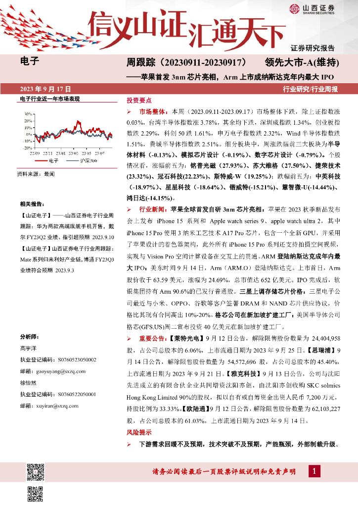 山西证券:电子周跟踪:苹果首发3nm芯片亮相,Arm上市成纳斯达克年内最大IPO.pdf
