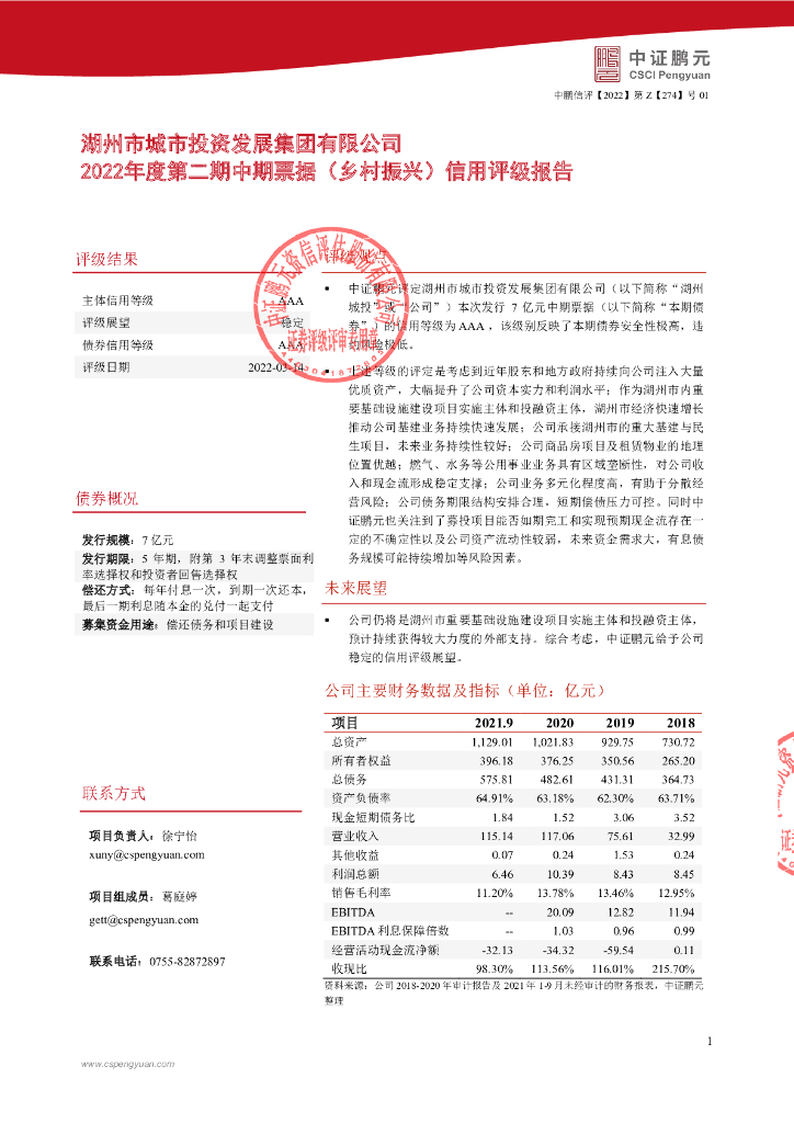 鹏元:湖州市城市投资发展集团有限公司2022年度第二期中期票据(乡村振兴)信用评级报告.pdf