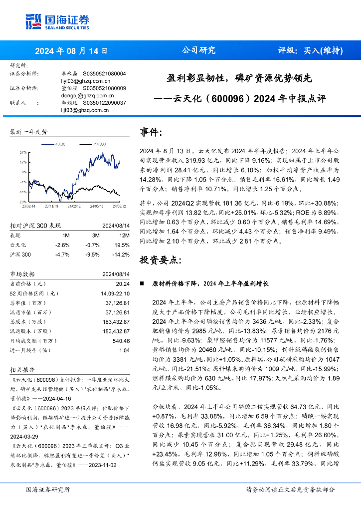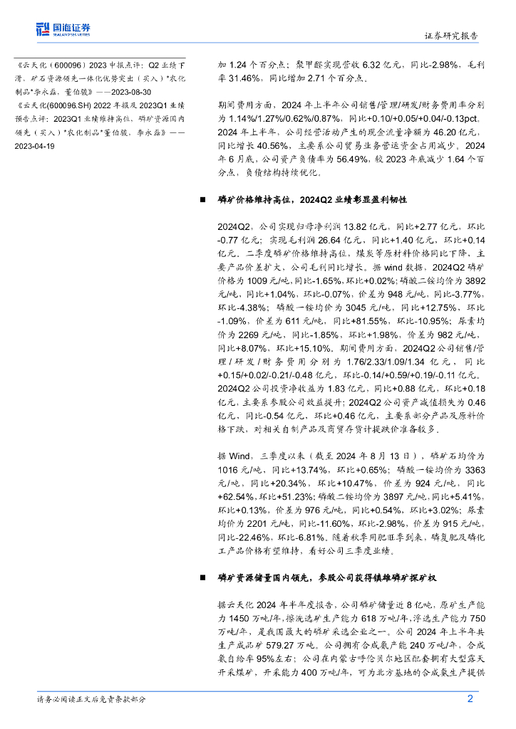 国海证券:云天化(600096)-盈利彰显韧性,磷矿资源优势领先年中报点评2024.pdf