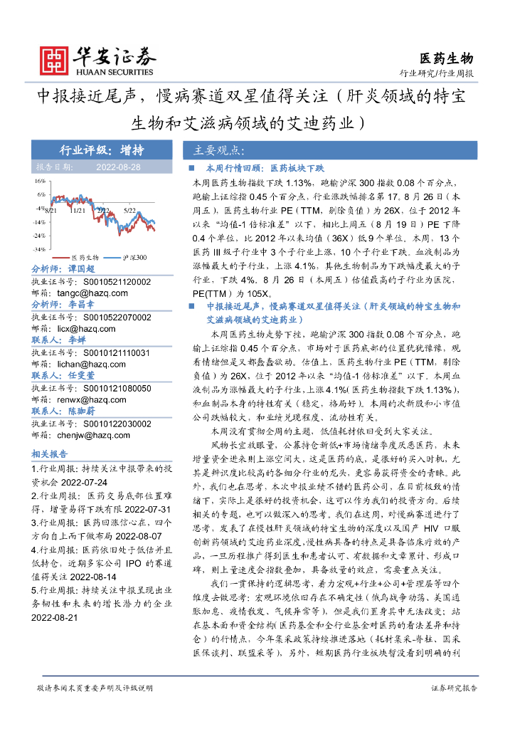 华安证券:医药生物行业周报:中报接近尾声,慢病赛道双星值得关注(肝炎领域的特宝生物和艾滋病领域的艾迪药业).pdf