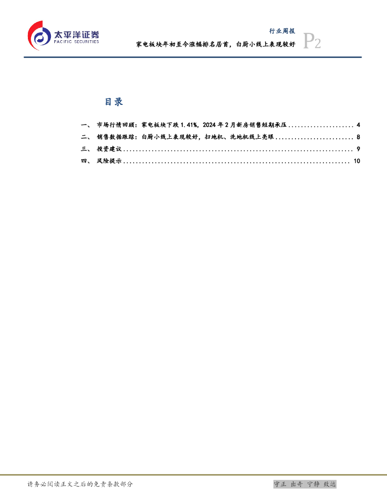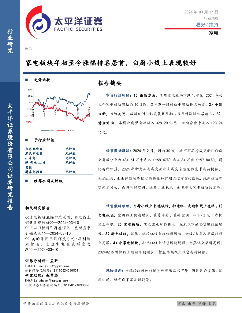 太平洋证券:家电行业周报:家电板块年初至今涨幅排名居首,白厨小线上表现较好.pdf