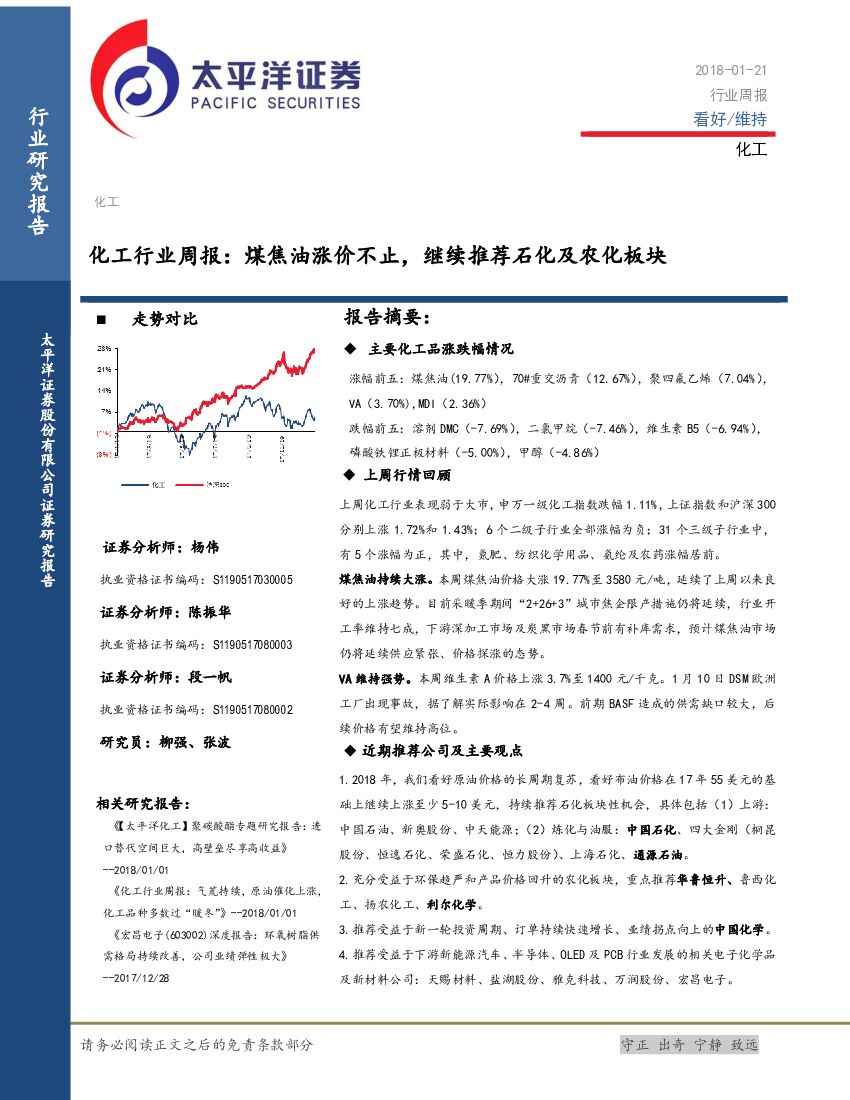 太平洋证券:化工行业周报:煤焦油涨价不止,继续推荐石化及农化板块.pdf