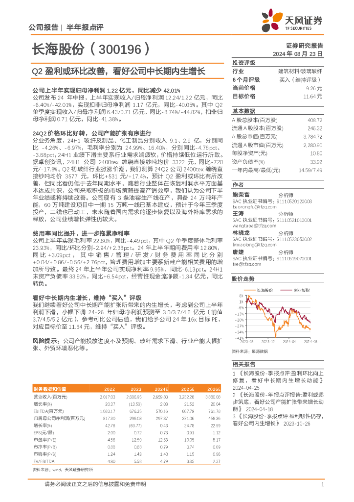 天风证券:长海股份(300196)-Q2盈利或环比改善,看好公司中长期内生增长.pdf