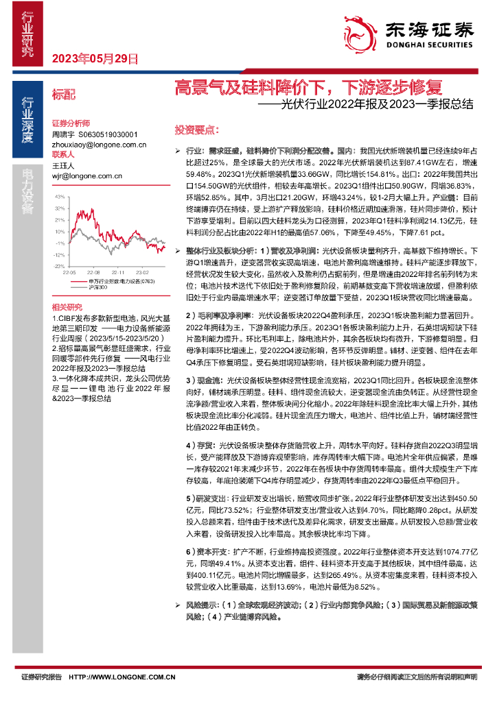 东海证券:光伏行业2022年报及2023一季报总结:高景气及硅料降价下,下游逐步修复.pdf