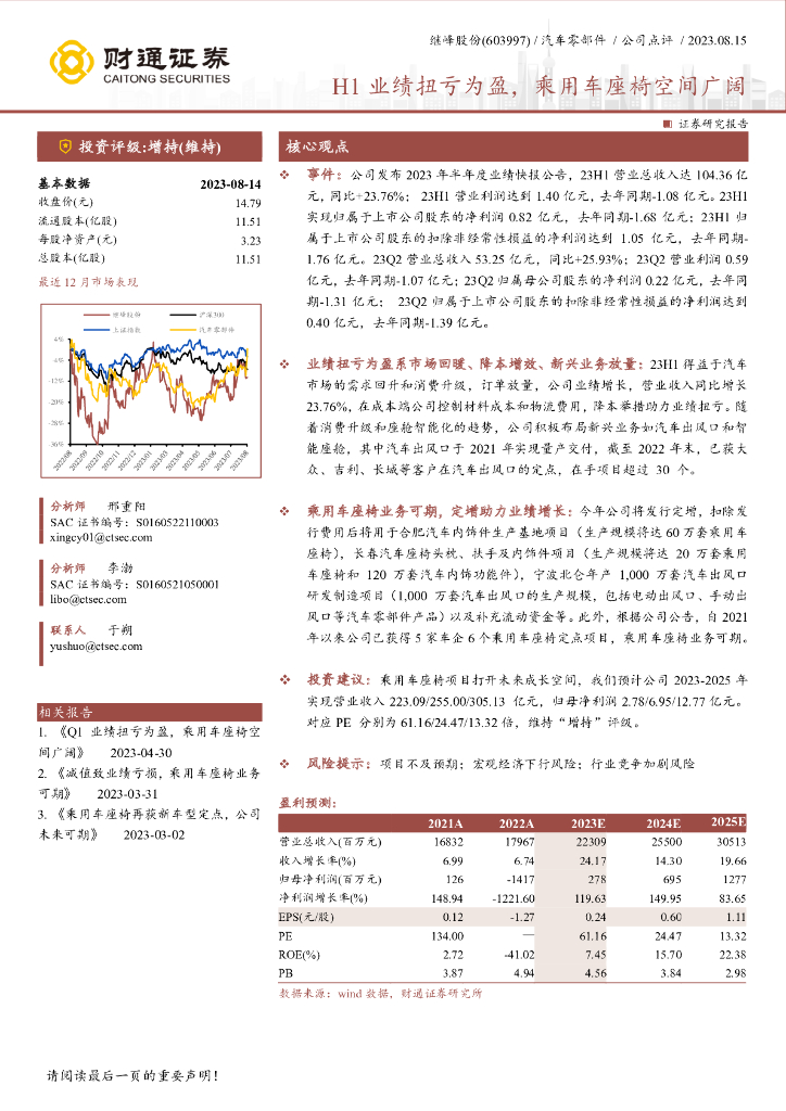财通证券:继峰股份(603997)-H1业绩扭亏为盈,乘用车座椅空间广阔.pdf