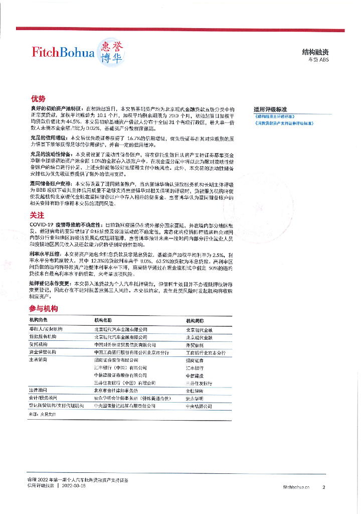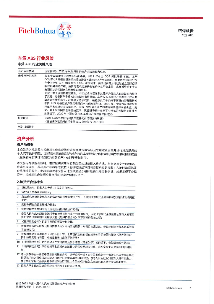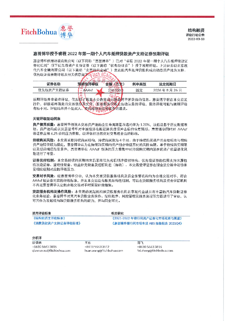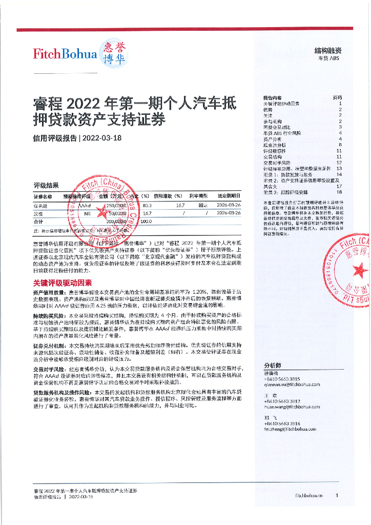 惠誉博华:睿程2022年第一期个人汽车抵押贷款资产支持证券信用评级报告及跟踪评级安排.pdf