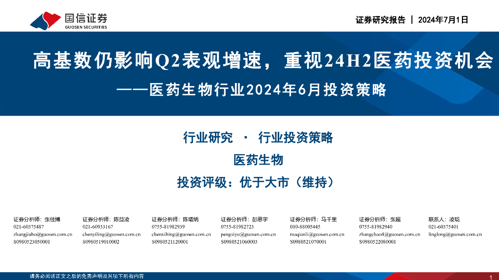 国信证券:医药生物行业2024年6月投资策略:高基数仍影响Q2表观增速,重视24H2医药投资机会.pdf
