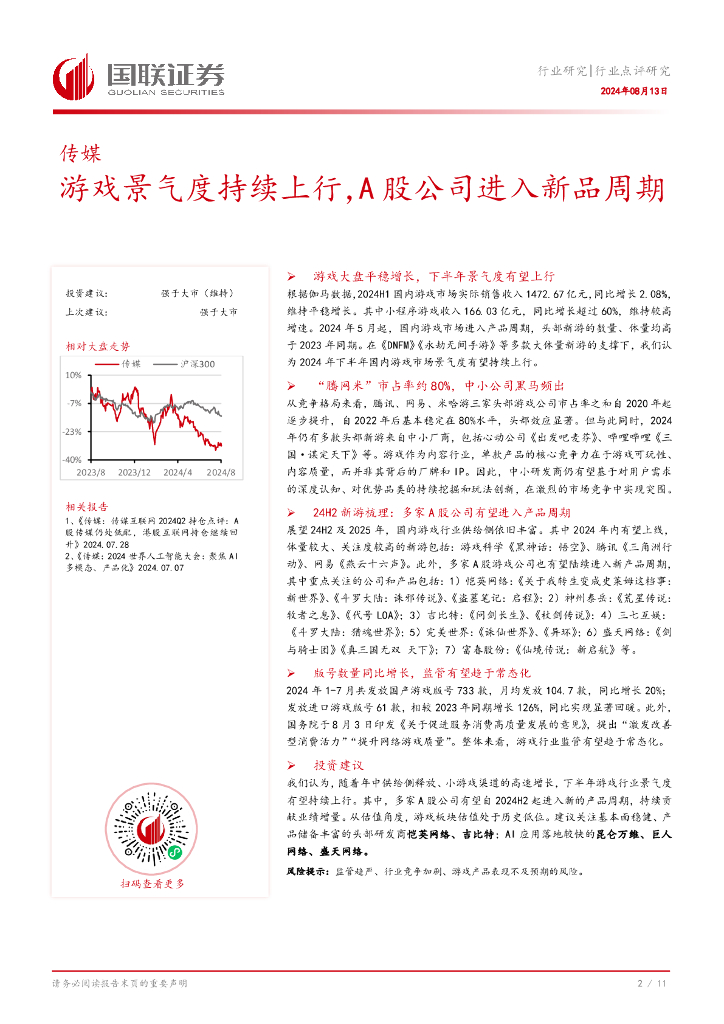 国联证券:传媒行业点评研究:游戏景气度持续上行,A股公司进入新品周期.pdf