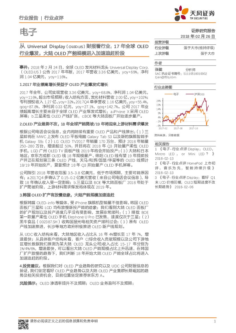 天风证券:电子行业点评:从Universal Display(OLED.US)财报看行业:17年全球OLED行业爆发,大陆OLED产能规模进入加速追赶阶段.pdf