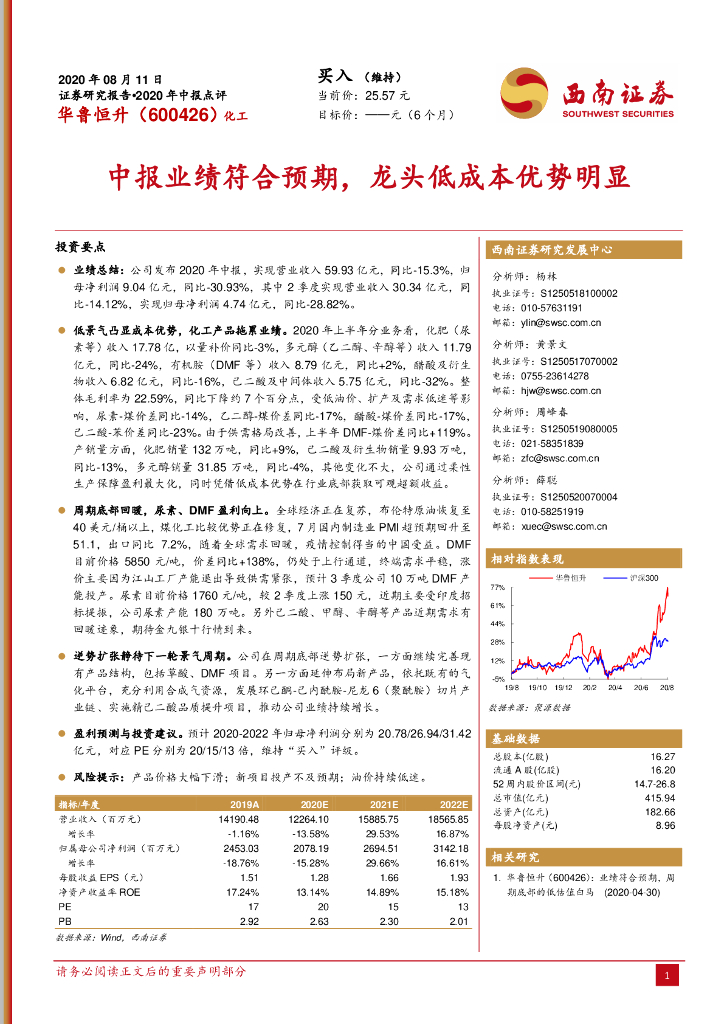 西南证券:华鲁恒升(600426)-中报业绩符合预期,龙头低成本优势明显.pdf