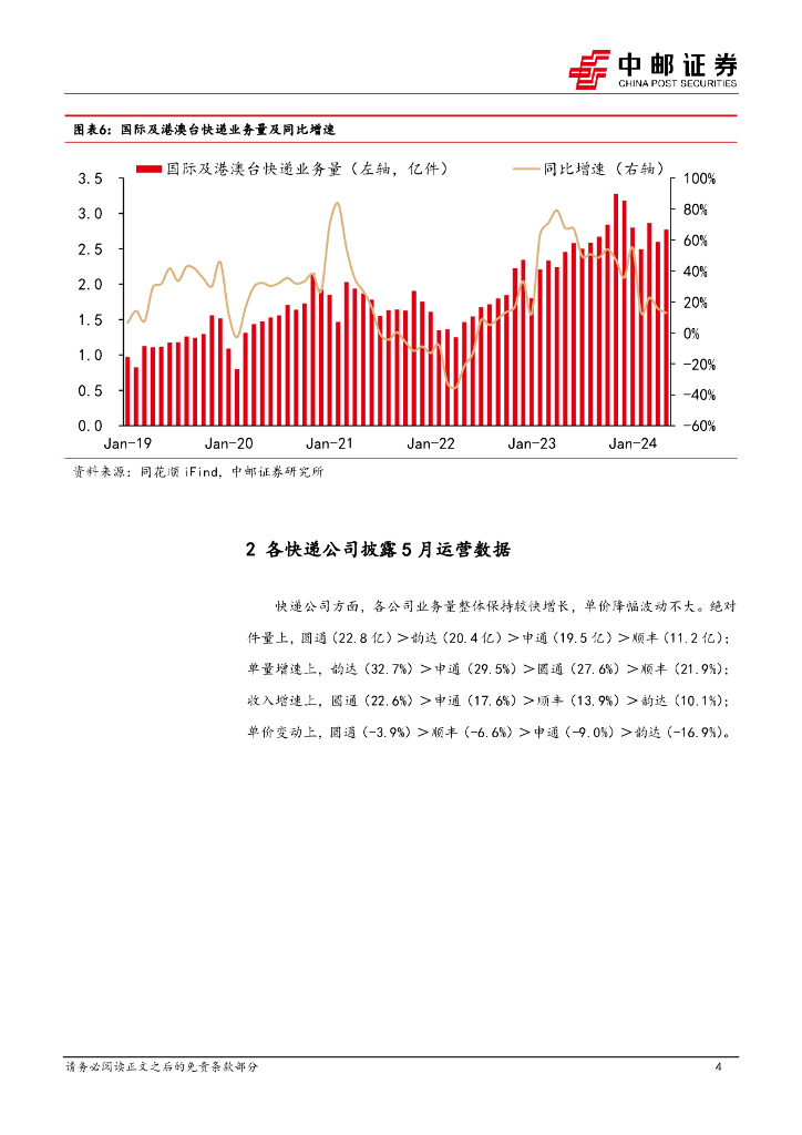 中邮证券:快递2024年5月数据点评:五月快递业务量维持较高增速,单价降幅保持稳定.pdf