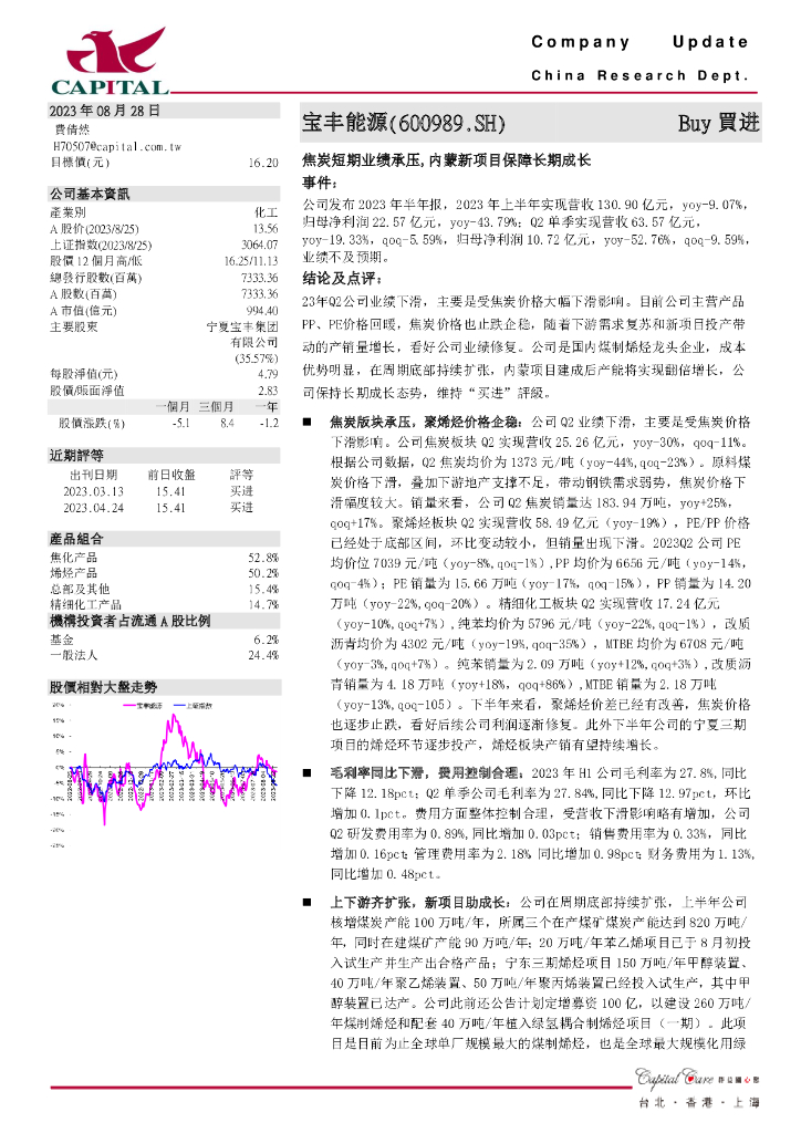 群益证券:宝丰能源(600989)-焦炭短期业绩承压,内蒙新项目保障长期成长.pdf