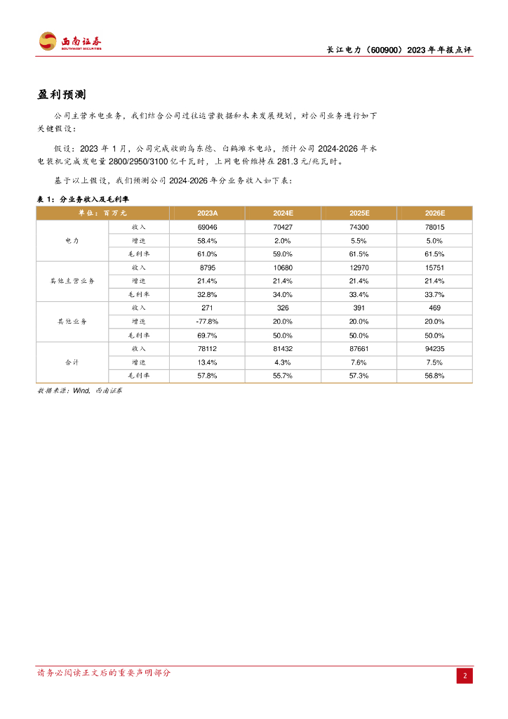 西南证券:长江电力(600900)-2023年年报点评:分红稳定,期待来水好转电量增发.pdf