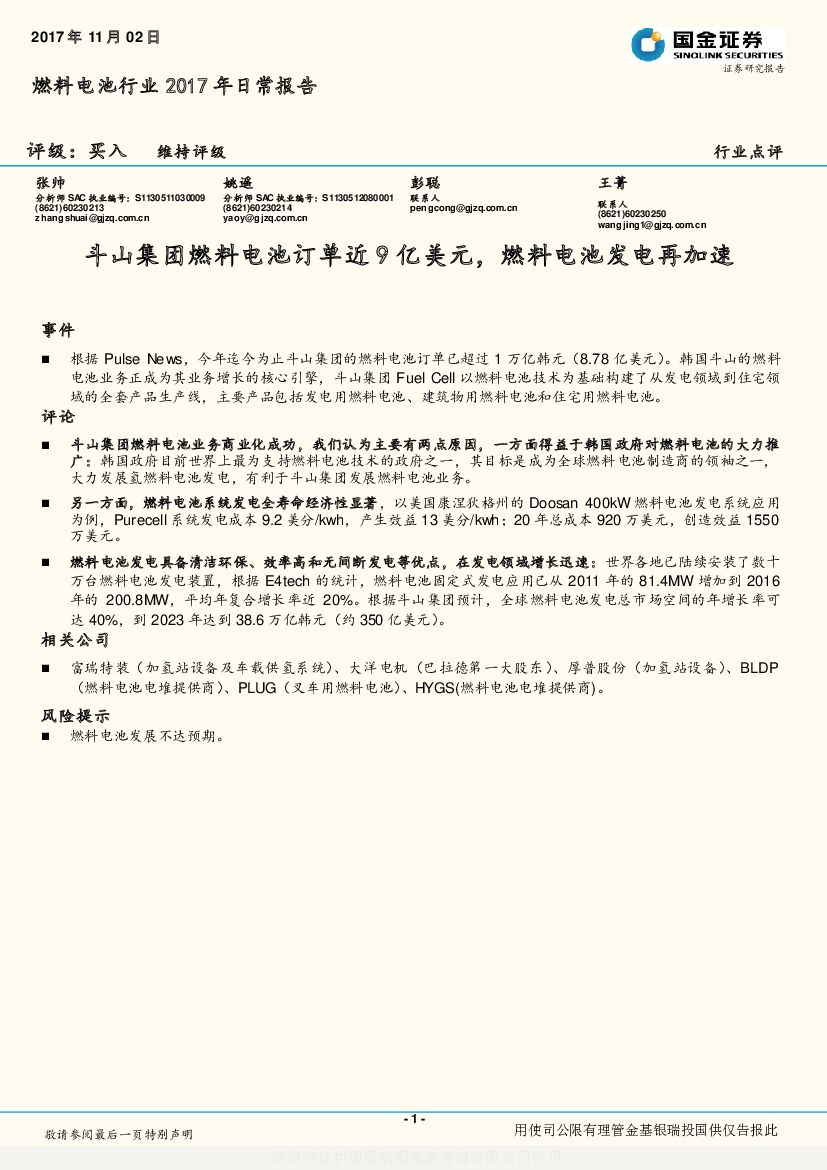 国金证券:燃料电池行业2017年日常报告:斗山集团燃料电池订单近9亿美元,燃料电池发电再加速.pdf