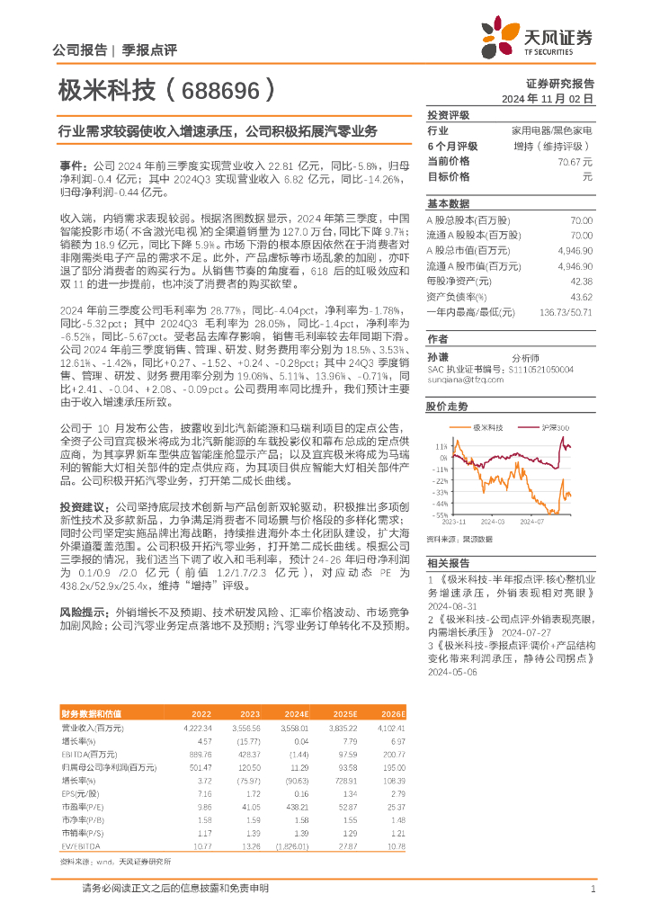 天风证券:极米科技(688696)-行业需求较弱使收入增速承压,公司积极拓展汽零业务.pdf