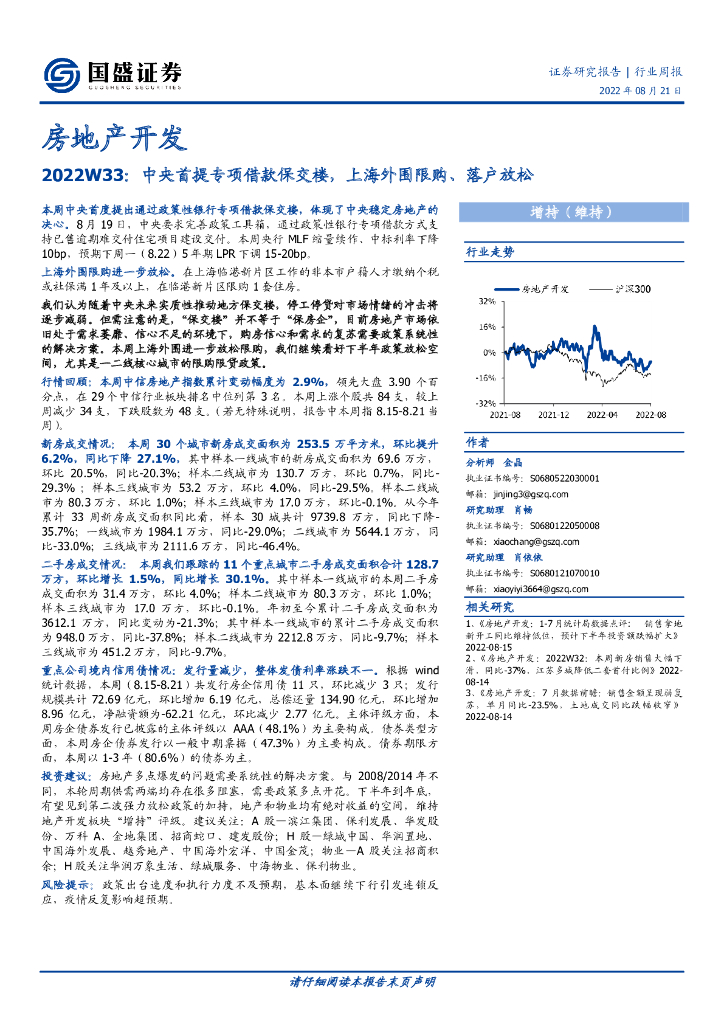 国盛证券:房地产开发行业周报2022W33:中央首提专项借款保交楼,上海外围限购、落户放松.pdf