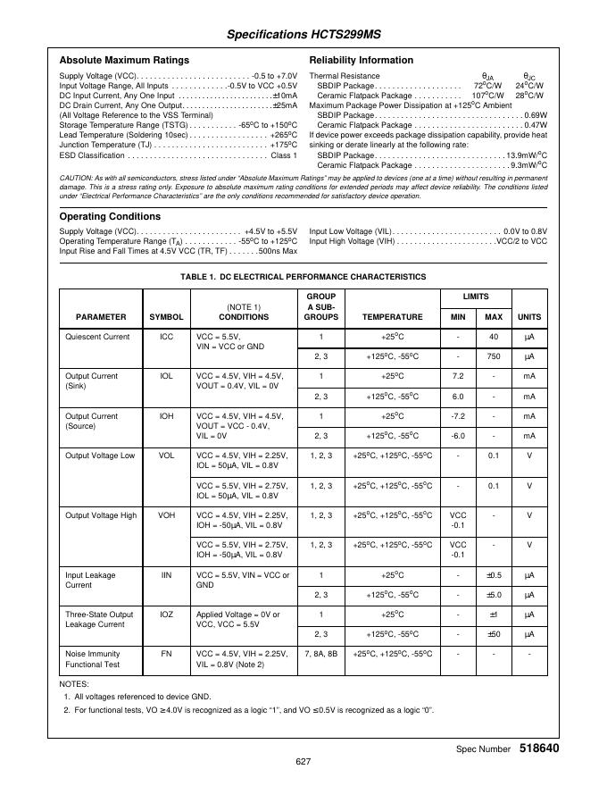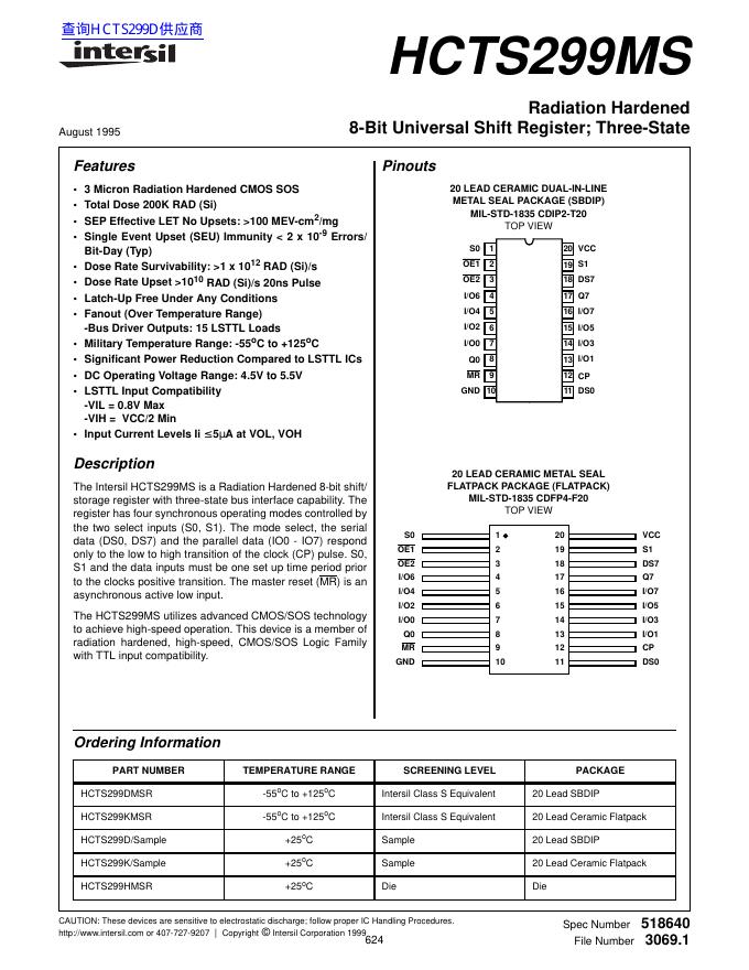 intersil HCTS299MS Radiation Hardened 8-Bit Universal Shift Register; Three-State 数据手册.pdf