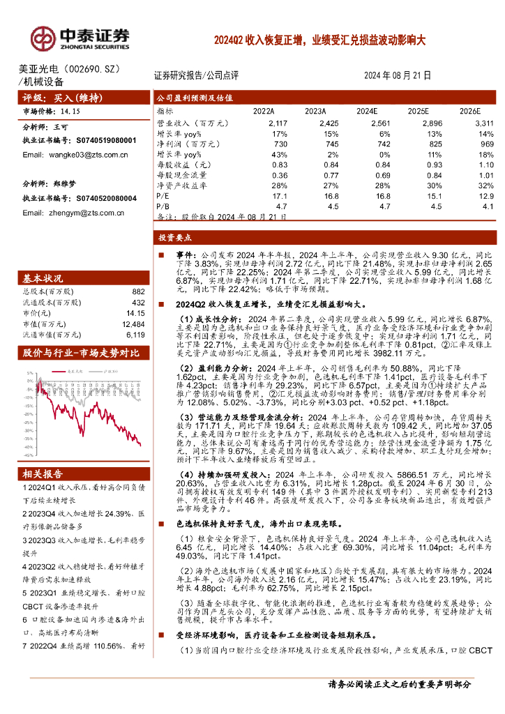 中泰证券:美亚光电(002690)-2024Q2收入恢复正增,业绩受汇兑损益波动影响大.pdf