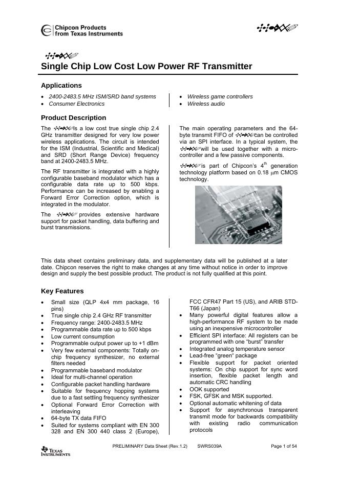 TEXAS INSTRUMENTS CC2550 Single Chip Low Cost Low Power RF Transmitter 数据手册.pdf