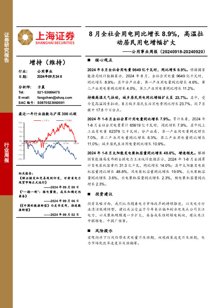 上海证券:公用事业行业周报:8月全社会用电同比增长8.9%,高温拉动居民用电增幅扩大.pdf