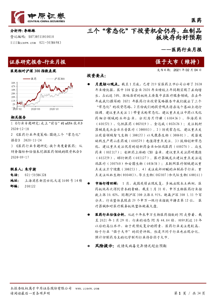 中原证券:医药行业月报:三个“常态化”下投资机会仍存,血制品板块存向好预期.pdf